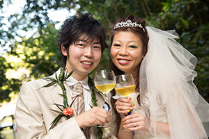 インパクトがある演出をしたかったので、ビデオはオリジナルのストーリー仕立てに。オープニングビデオの中で、おじいさんとおばあさんに扮(ふん)したふたりがカウントダウンし、今年になった瞬間に別々の入り口から歌いながら入場。ゲストにペンライトを振ってもらい、ライブのような盛り上がりに。キャンドルサービスをしながらお色直しの中座をした後、ゲストにロビーへ移動してもらって人前式という変わったプログラムにして、誓いの言葉も自分たちで考えました。テーブルのディスプレーなども手作りして、「ふたりらしいね」と大好評。