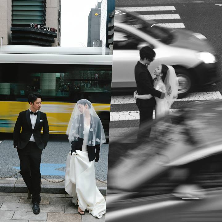 平日の人通りがある中での撮影だったそうですが、ふたりが照れ笑いしている様子もかわいらしい! 作り込み過ぎず自然体なふたりの姿は、モノクロ写真だからこそダイレクトに伝わってきますね。
