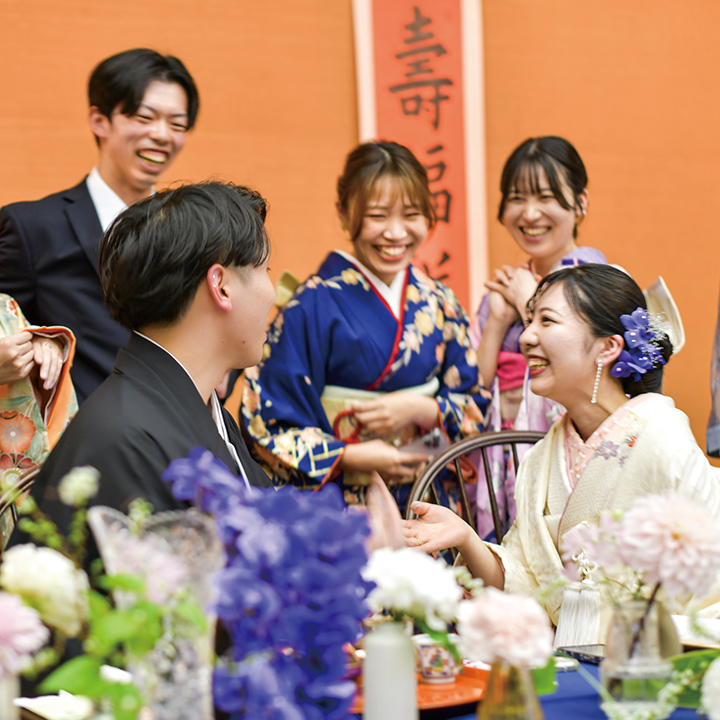「家族や友人に改めて感謝の気持ちを伝え、愛あふれる一日にしたくて」と、新婦の真麻さん。ゲストには旅の気分も味わってもらおうと、新郎の悠太郎さんの地元・関西と、真麻さんの地元・福井からアクセスしやすい京都で結婚式を行うことにした。大正時代の歴史的な邸宅をモダンにアレンジした会場は、思い描いていたふたりのイメージにぴったり。美しい日本庭園の緑を背景にしたファーストミートや家族への感謝を伝える挙式が、温かい雰囲気の中で行われた。披露宴では緑の庭園を背景にした高砂席の空間が絶好のフォトスポットに。プログラムはお互いの地元の友人によるスピーチや、余興のビデオ上映にたっぷりと時間をかけた。「余興では私の好きなところをみんなが挙げてくれて。本当に大切に思ってくれている友人が、こんなにもたくさんいることに感謝しなければと改めて思いました」と、真麻さん。披露宴のエンディングにふたりが用意したのは、お互いの家族へのメッセージや贈り物だけではなく、自分たちの言葉をつづったゲスト全員へのクロージングレタータイム。そこには一日では話し足りなかった感謝やお礼の気持ち、ふたりの愛情がたくさん詰まっていた。