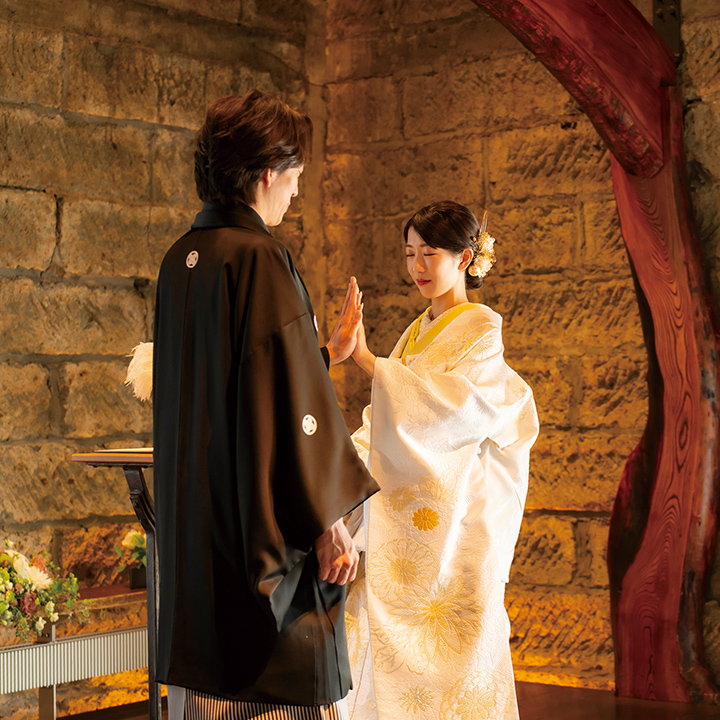 「大聖堂のステンドグラスが圧巻。会場選びの決め手になりました」と新婦