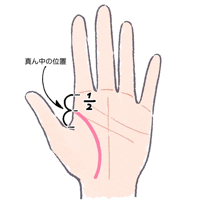 人さし指と親指の間から手首の方に伸びるのが生命線です。人さし指と親指の付け根のちょうど真ん中くらいからスタートするのが生命線の標準的な位置です。