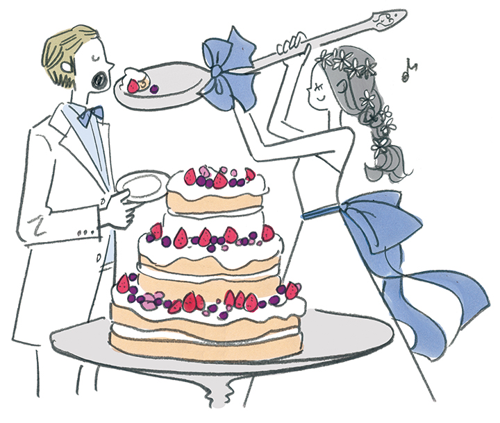 新郎新婦が最初の共同作業になるといわれるケーキカットの後、お互いにケーキを食べさせ合うファーストバイトをするのが一般的な流れ。仲の良い様子をお披露目でき、ゲストが注目するシーンなので、ケーキではなく好きな食べ物をカットして、ふたりらしさを表現するのもおすすめ。