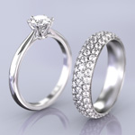 どのデザインが高くて、どのデザインが安いということはありませんが、ダイヤモンドをたくさん飾ったパヴェリングは高価になる傾向に。とはいえ、ソリティアリングでも1粒のダイヤモンドが大きくて品質が高ければ、金額は高くなります。