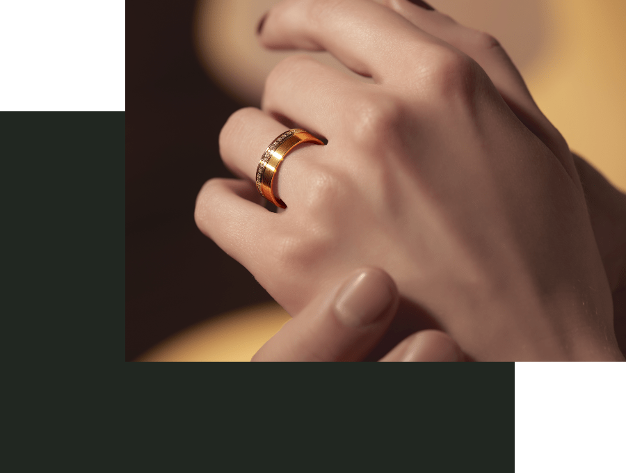 女性らしい魅力を引き立てるウェービーで華やかなスタイルには、存在感が際立つレイヤリングがおすすめ。エンゲージリング、マリッジリング単体よりも重ねることでリングの持つストーリーに奥ゆきやこなれ感が生まれる。さらにエタニティリングを加えれば、より一層ドラマチックにきらめく指先に誰もが惹きつけられるはず。