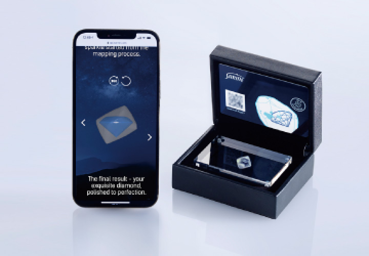 原石からふたりの指元に届くまでの道のりが分かる「ダイヤモンドジャーニー」を世界初導入。自社一貫体制だからこそいち早く実現できたシステムです。エクセルコでは、ふたりのダイヤモンドの原石模型(写真右側)もプレゼント。
