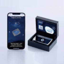 原石からふたりの指元に届くまでの道のりが分かる「ダイヤモンドジャーニー」を世界初導入。自社一貫体制だからこそいち早く実現できたシステムです。エクセルコでは、ふたりのダイヤモンドの原石模型(写真右側)もプレゼント。
