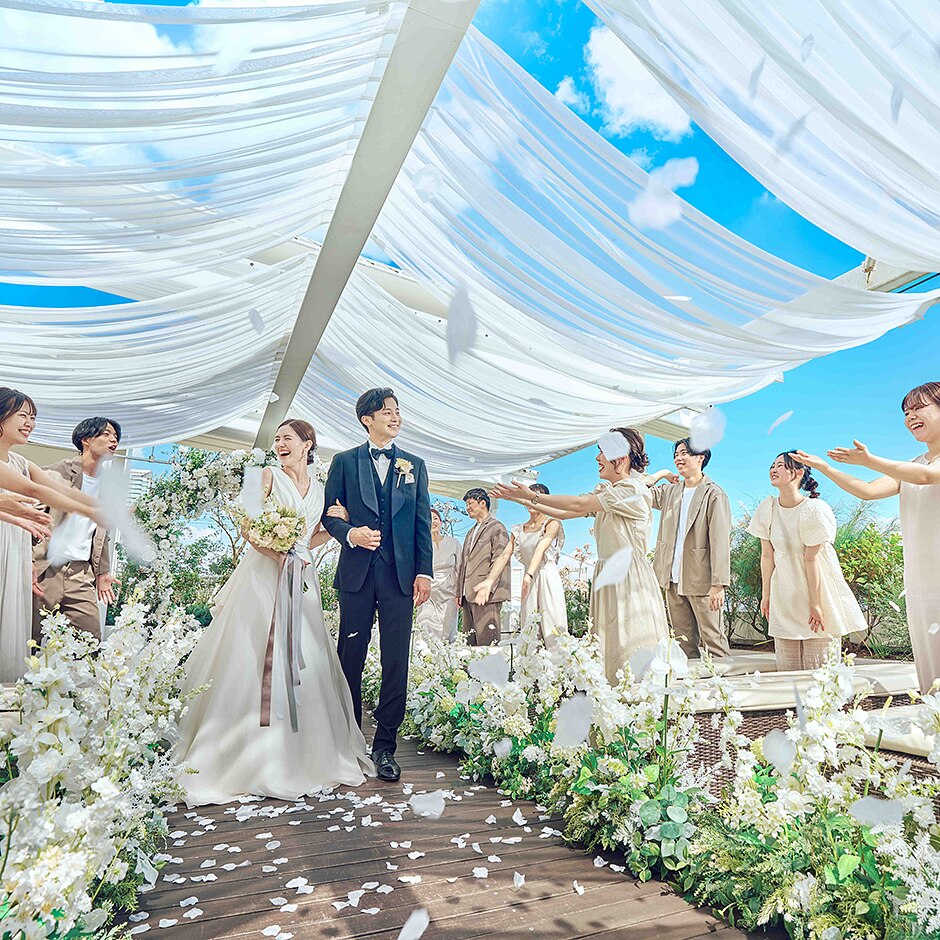 透き通る青空も祝福するかのようなフラワーシャワーは先輩花嫁にも好評