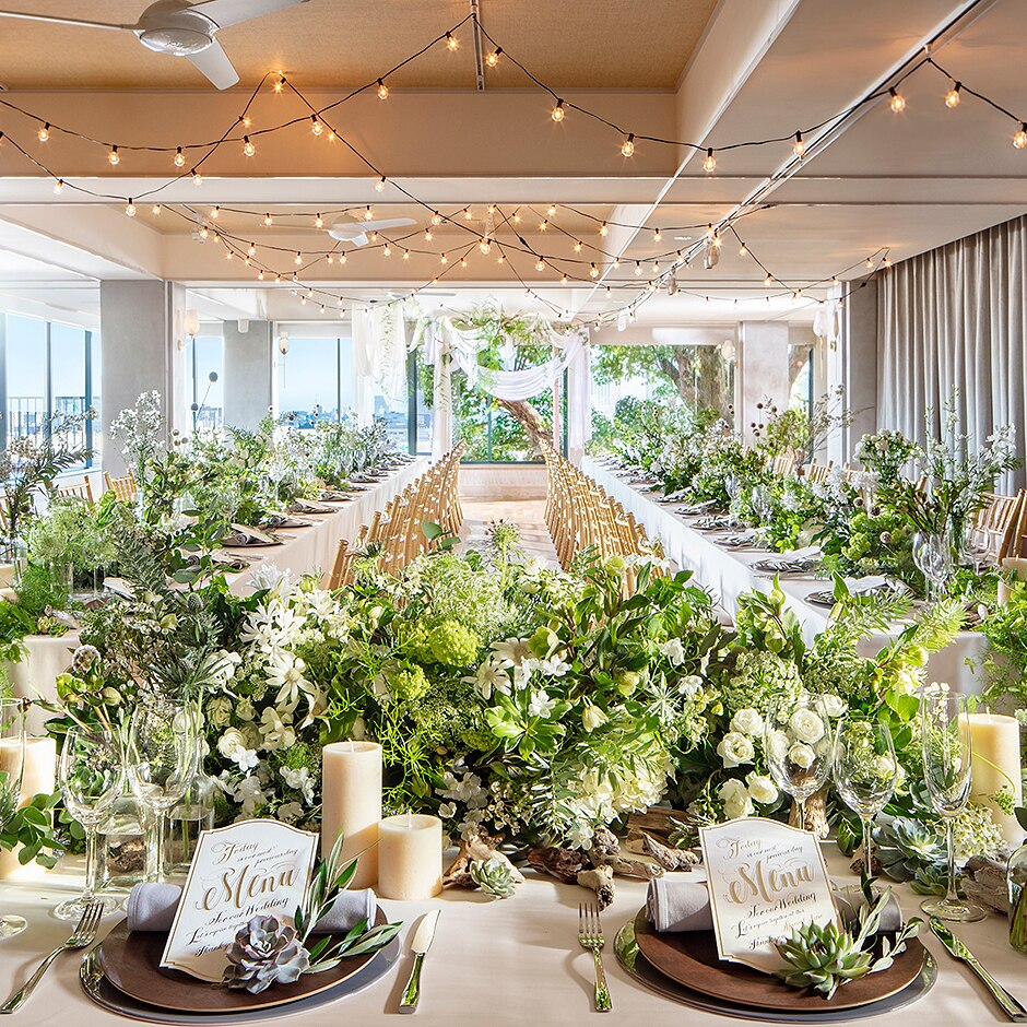 季節ごとの風が優しくそよぐ開放的な空間。高台から望む海・空・緑が圧巻でゲストの心にも特別な想い出として刻まれる