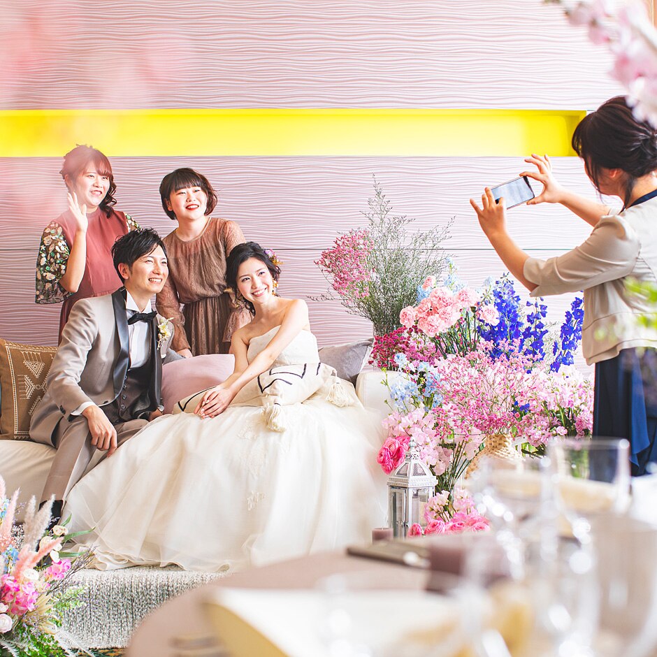 装花で彩られたメイン周りはフォトブースに。みんなの笑顔に囲まれて最幸の一日