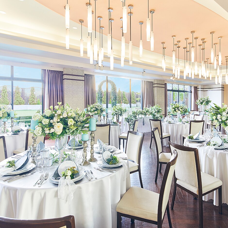 窓越しに外の景色も楽しめ、ガーデンではデザートビュッフェや自由度の高いパーティーが可能 -