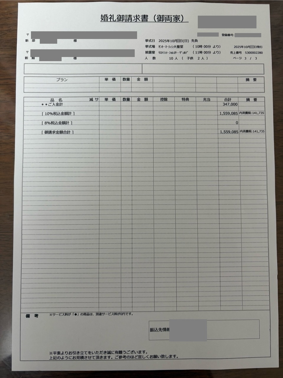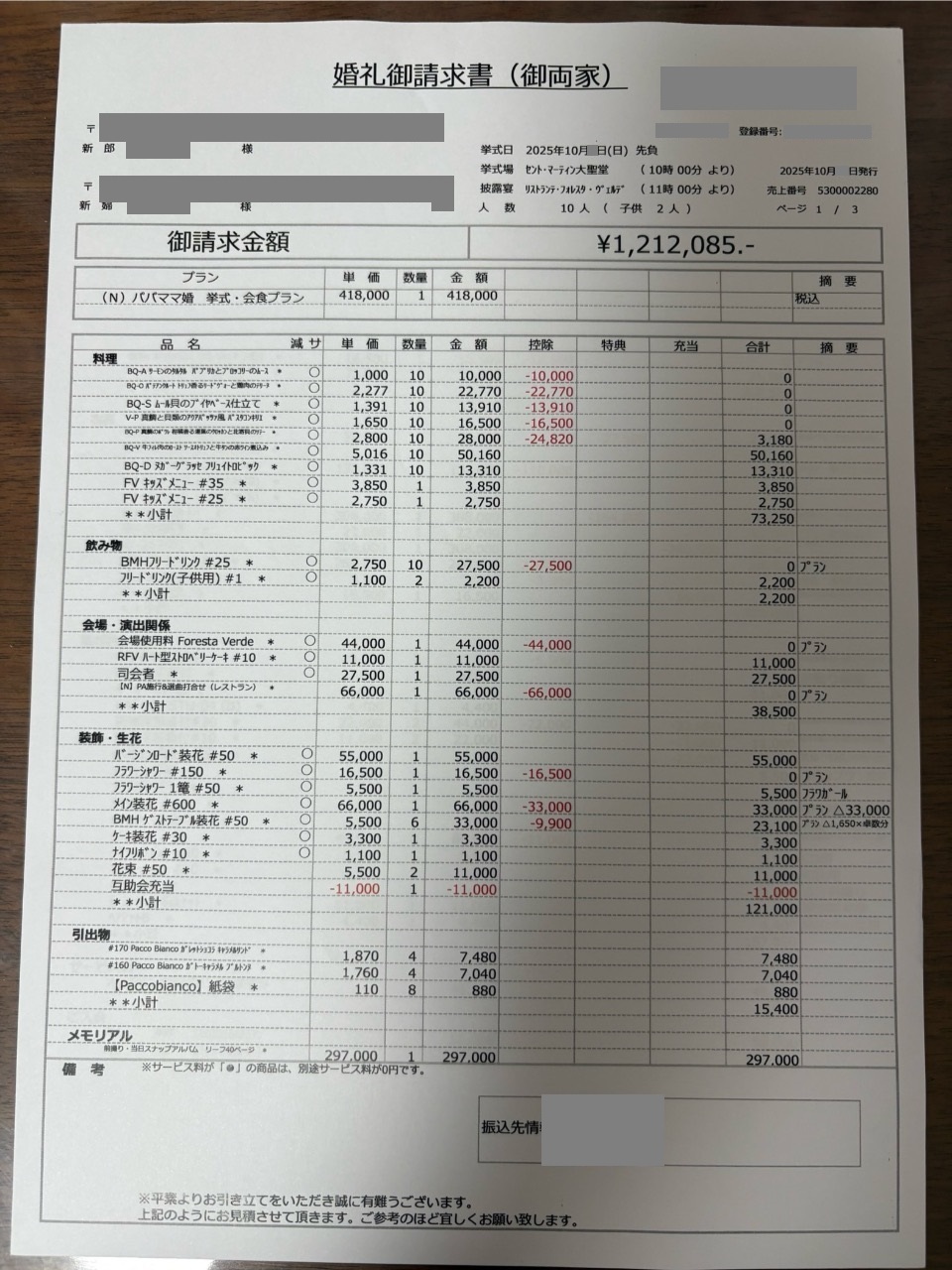 ※投稿された金額情報は、日取り、申込みのタイミングや会場の空き状況等によって異なるため、最終費用明細の項目や金額をもとにした、式場との価格交渉や追加サービス等の要望はご遠慮ください。