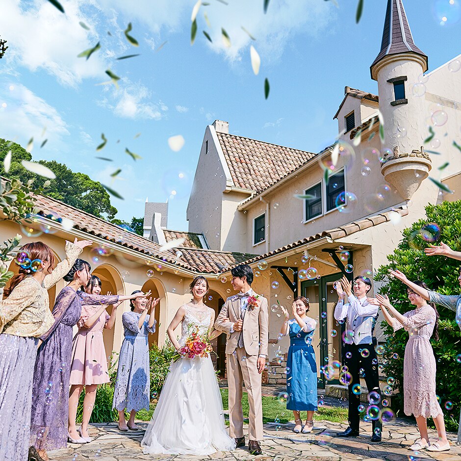 青空と海に囲まれたロケーション、物語のお城のように塔がそびえるアンティークなチャペルにひとめぼれ。外観・内装ともにアンティークな雰囲気で、ウエルカムスペースの小物も含めてふたりのイメージにぴったり。「料理の試食や持ち込みについても相談させていただき、希望が叶いそうだったので1軒目で即決しました」。