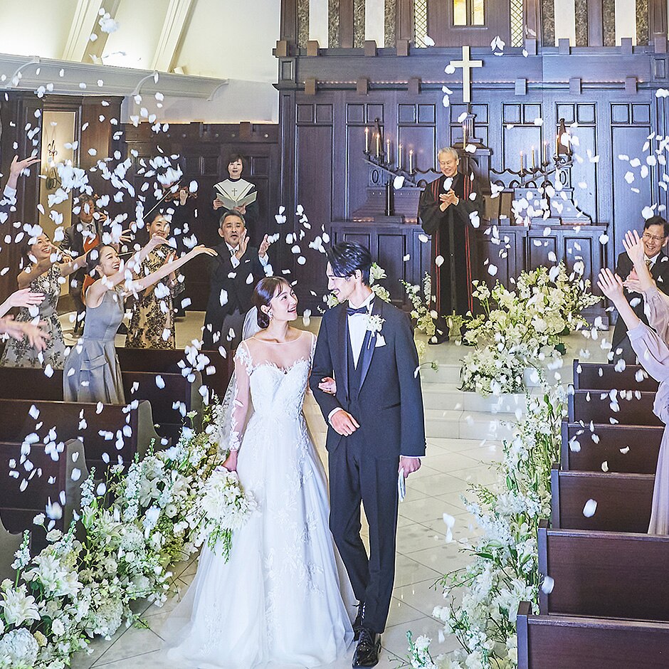 足を踏み入れた瞬間に広がるクラシカルな建築美と、木のあたたかさ。静寂に満ちた礼拝堂で、思わず息をのむほど美しい挙式を