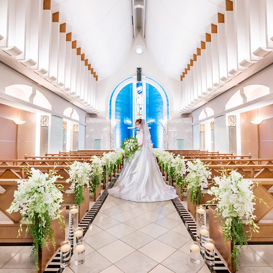 白大理石のバージンロードに「光・水・緑」を表すステンドグラスが映り込む美しいチャペル -
