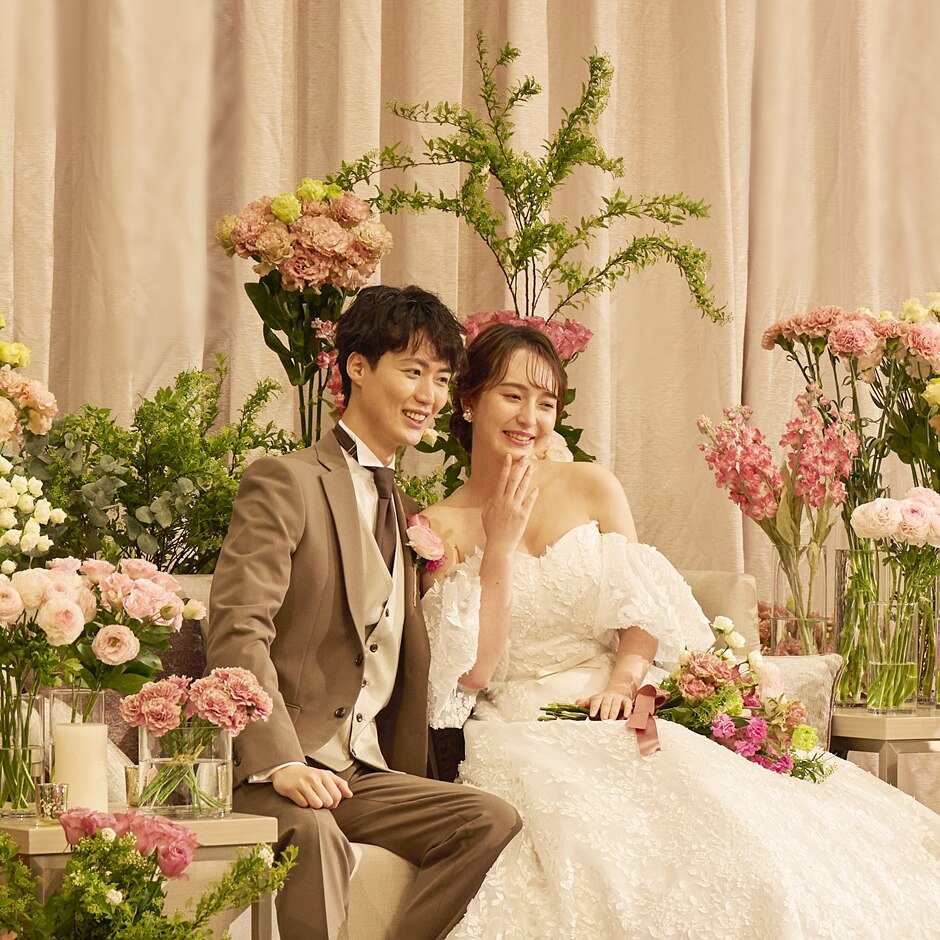 メイン席はドレス姿の花嫁を心地よい柔らかさでゆったりと包み込むソファ。大人フェミニンな会場に合わせた優しい色合いで座り姿までも美しく