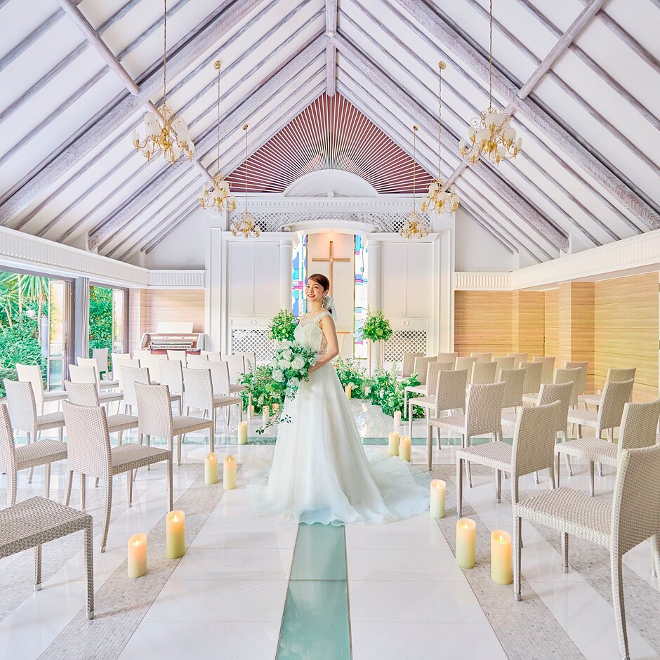鮮やかな緑と輝く滝が祭壇を彩る、透明感あふれるプライベートチャペル