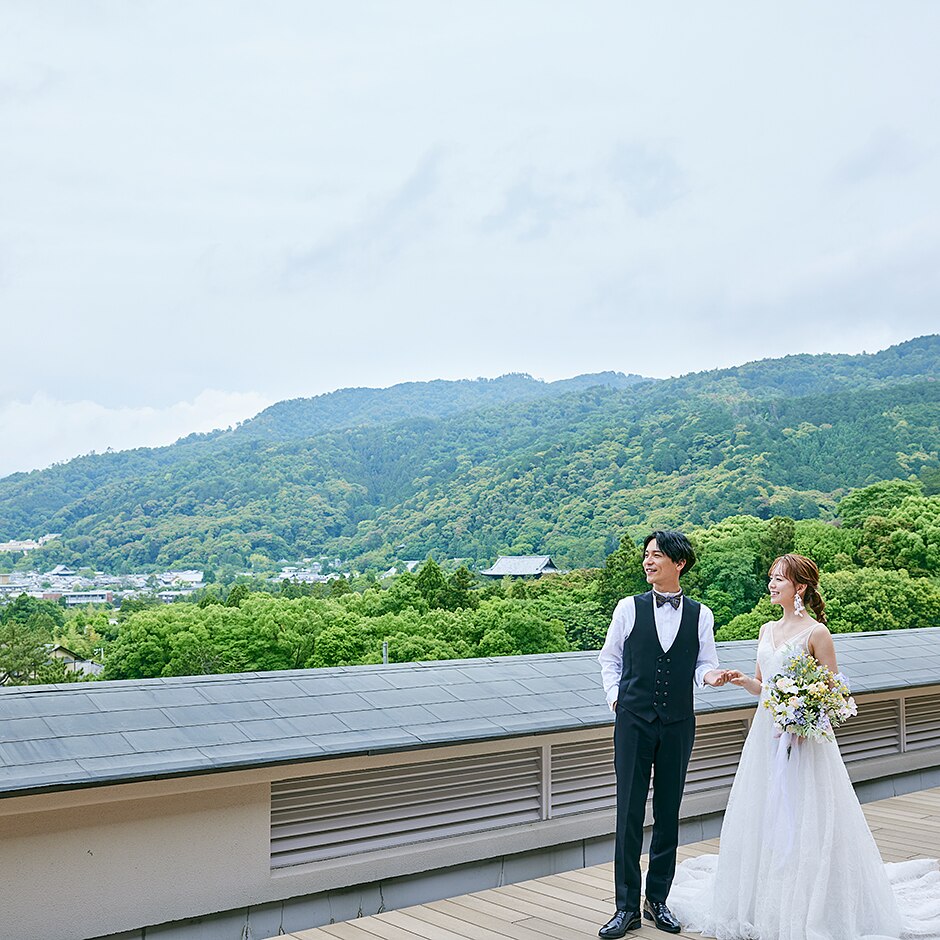 約1万6000坪の広大な敷地に、京都市文化財(名勝)登録の回遊式庭園や京の街並みを望むガーデン、日本の建築美が息づく数寄屋風別館「佳水園」を有し、四季折々に京都らしい風情を感じながら特別なフォトを残せる