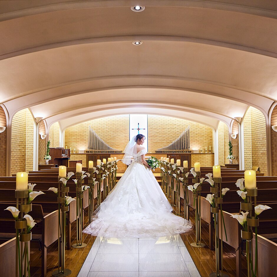木のぬくもりと陶の壁 大理石のバージンロードが造りだす あたたかな雰囲気のチャペル -