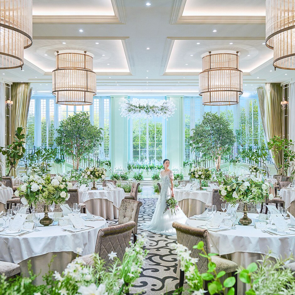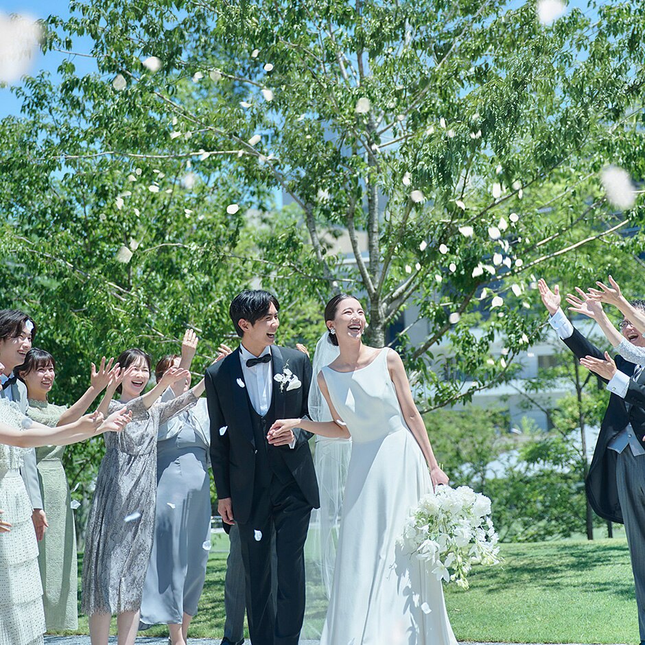 「自然をもっとそばに、包まれるように感じてほしい」という想いを込めた挙式空間へ。花びらのオブジェ、緑の装飾、光が美しく調和し、街の中心とは思えない自然を感じながら一生の誓いを立てて。 -