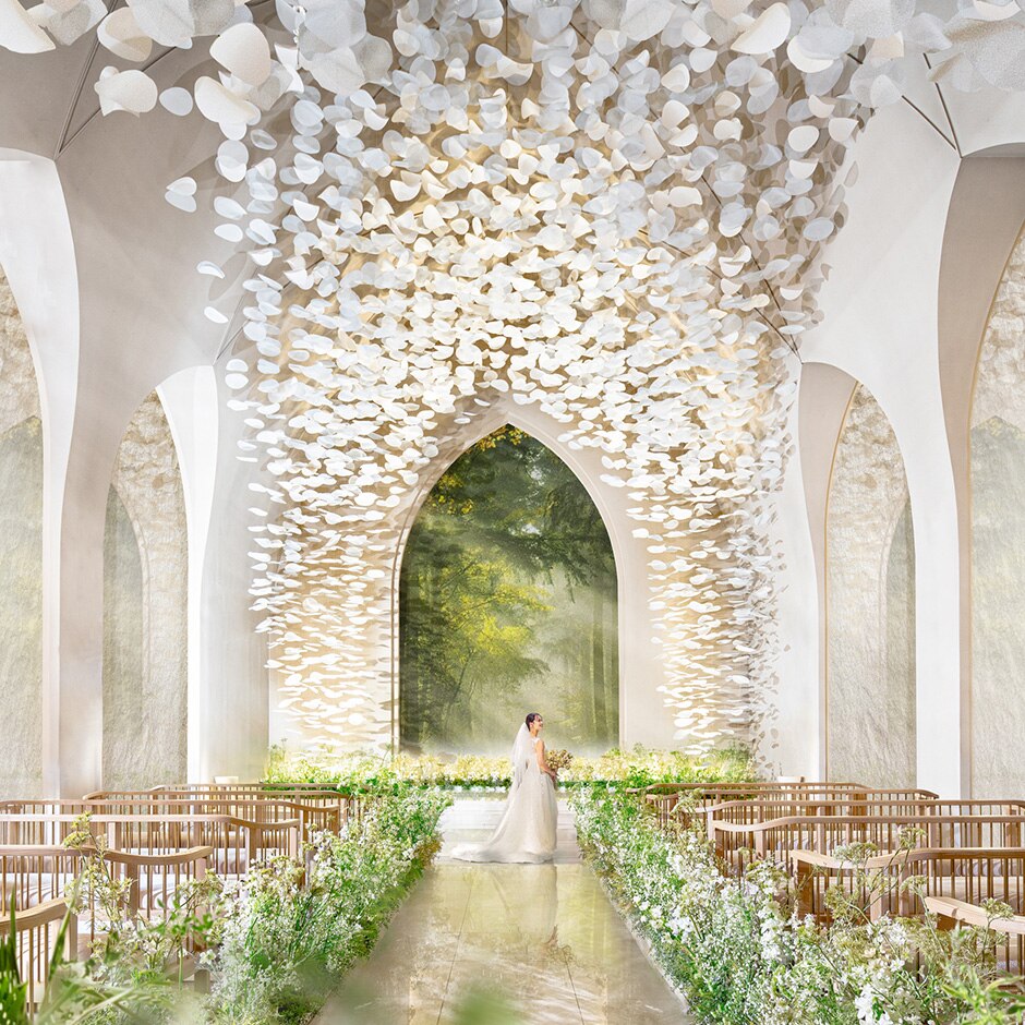 自然と光が柔らかに溶け合う「Celebration Hall -The Nature-」挙式会場が完成。天井から降り注ぐ花びらの光のオブジェがふたりを祝福。仙台の杜に相応しい神秘的な空間で挙式が叶う。/完成予想図