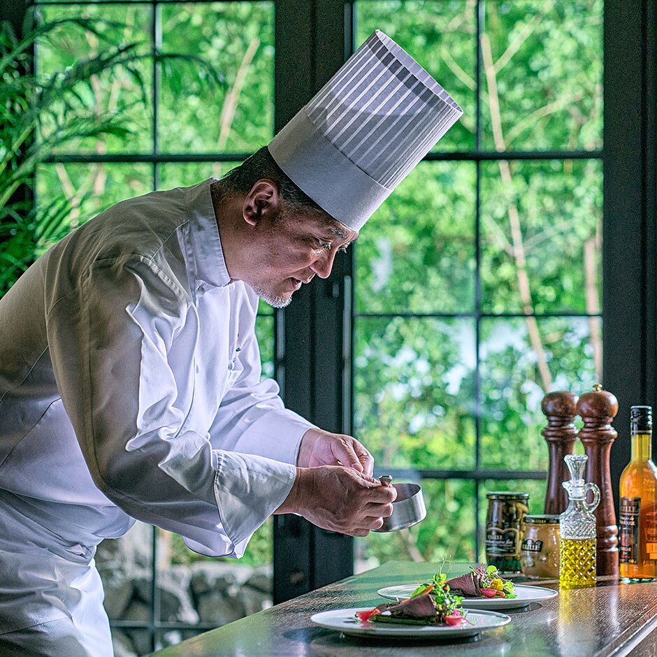 【オリエンタル】緑豊かなガーデンテラスとできたてのお料理が並ぶオープンキッチンが魅力。自然光があふれる開放的な空間且つ、換気も目で見えるので皆様と安心安全にお食事をお楽しみください