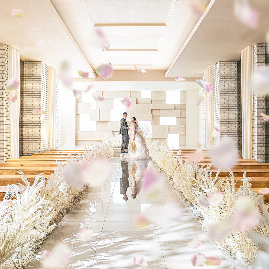 真っ白な空間に射し込む陽光と自然素材を取り入れた印象的なチャペル【サウンドホール】自然光がおふたりを優しく照らす。ギターとチェロの生演奏や歌声が響き渡る、神聖な瞬間も印象的。安らぎ包むひとときを。