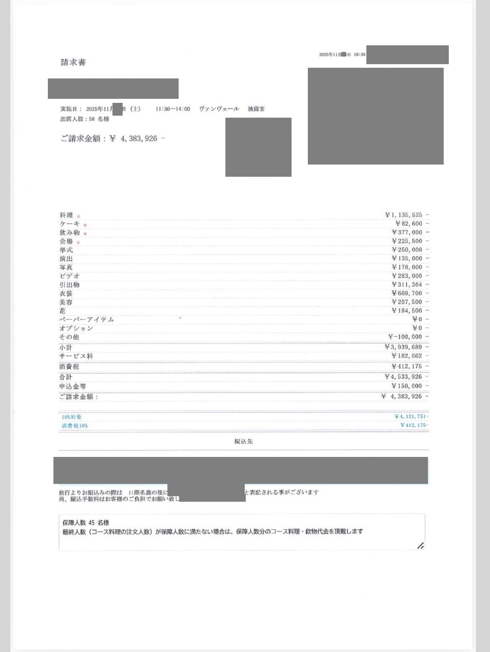 ※料金実例では申込金などを含む会場に支払った"総額"を表示しています。また、料金明細画像の項目名をもとに独自の基準で分類しています。