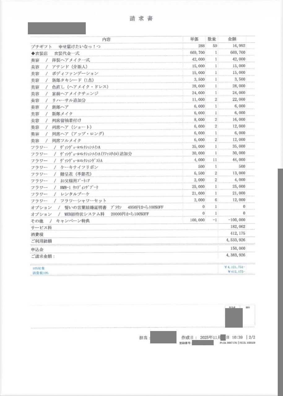 初期見積もりから100万は上がる覚悟でしたが、ドレスや料理などこだわりポイントが多かった分、予想以上の金額UPとなりました。