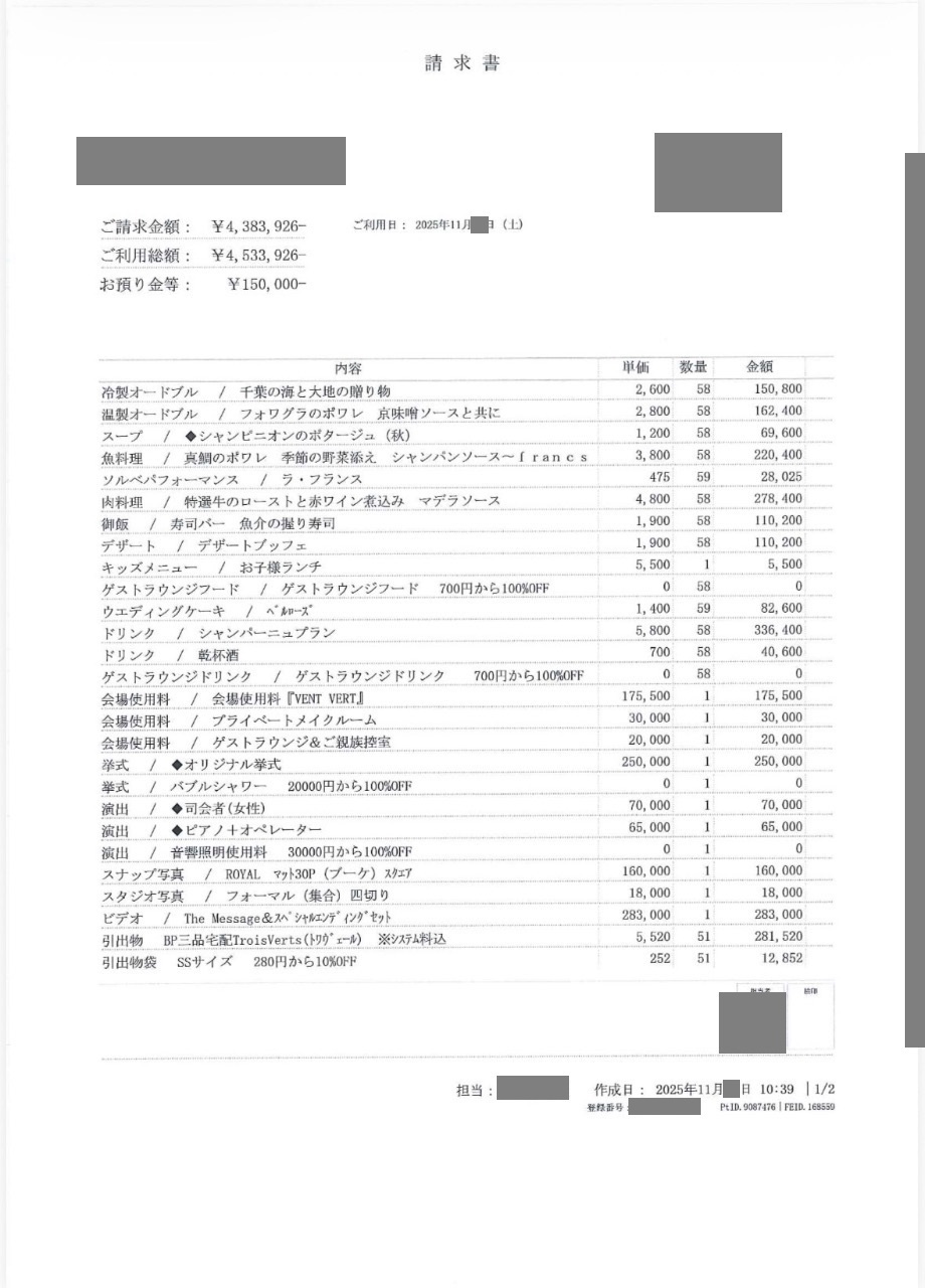 ※投稿された金額情報は、日取り、申込みのタイミングや会場の空き状況等によって異なるため、最終費用明細の項目や金額をもとにした、式場との価格交渉や追加サービス等の要望はご遠慮ください。