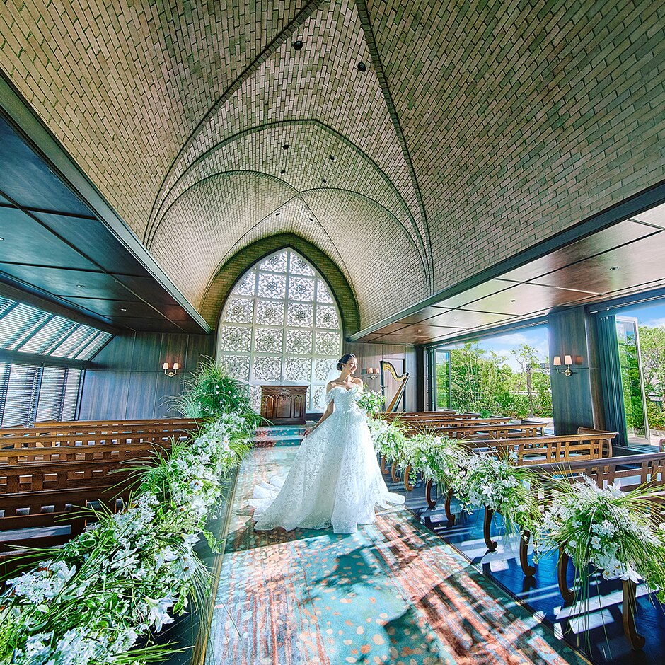 美しい陽光と緑溢れる上質な空間の中で挙式が叶う。 -