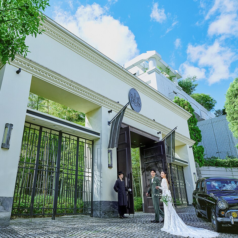 エントランスを抜けると都会の喧騒から離れ、非日常空間が広がる。訪れた瞬間から感じる伝統と格式、大空へと伸びる青々とした緑の竹林が古き良きものと未来が繋がるウェディングへと誘う。