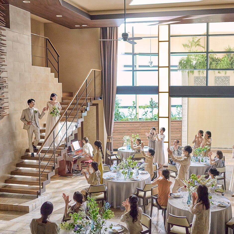 一面ガラスのテラス空間にある階段からはサプライズ入場も叶う! -