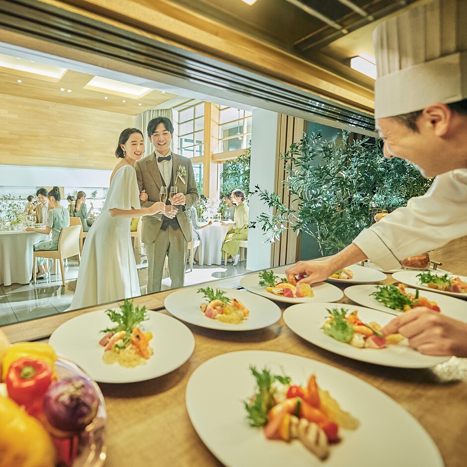 全会場オープンキッチン付き!直前まで100度に温められた器で、出来たてを秒単位でゲストに届けてくれる。オリジナルメニューの対応やゲストが当日和洋のソースを選べるなど、レストランクオリティのサービスも魅力