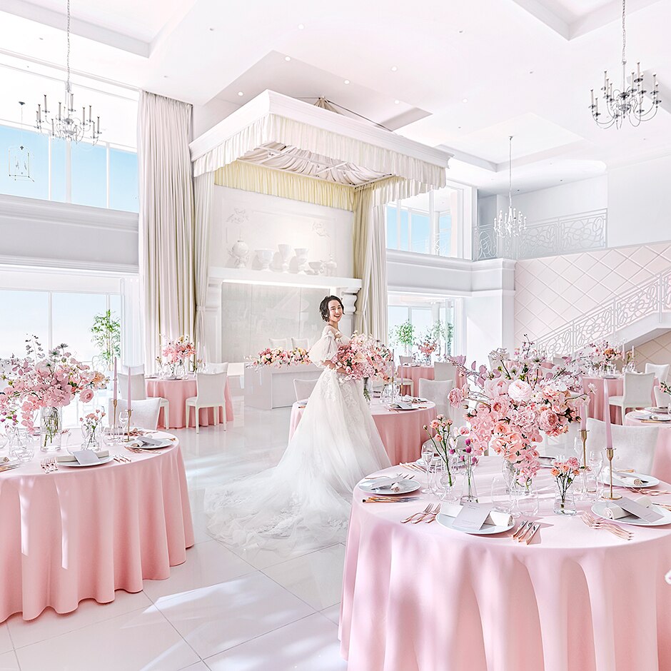 大人可愛い世界観で注目を集める会場「ラフィネ」。花嫁美が引き立つ仕掛けのみならず、ゲストを退屈させない付帯設備も充実。入場演出が叶う大階段を中心に、より一層写真映えを狙える空間になったので逃さず確認を