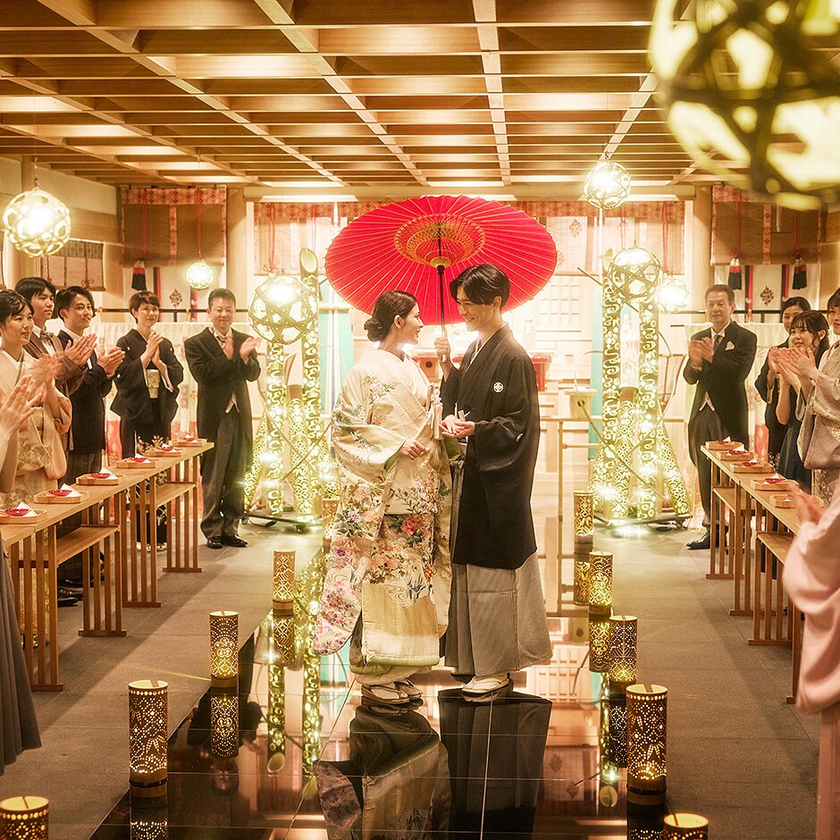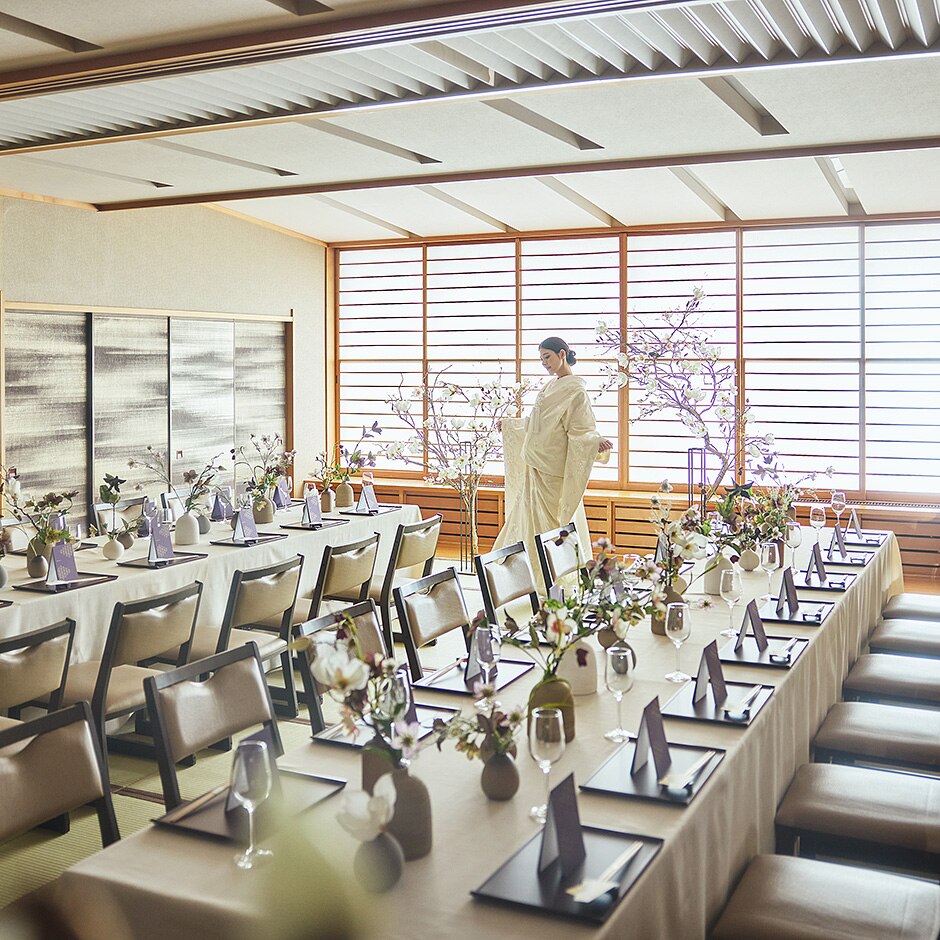 【出雲大社】の神が祀られた本格的な神殿を体験。最大90名様まで参列いただけるので、親族だけでなくご友人も一緒に参列が可能!日本料理「京都つる家」の料理を加えた和洋折衷コースもご提案。