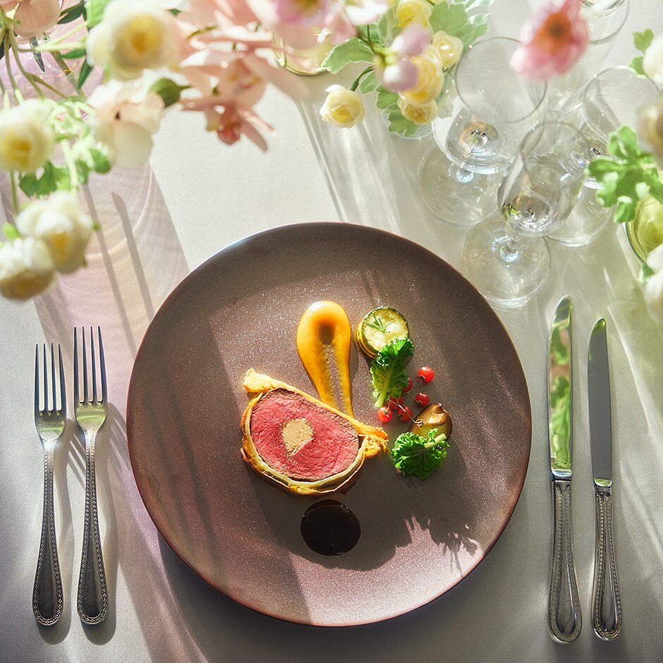 - スタッフより/「多くの賞を保持するシェフが作る逸品と、ゲスト人数や好みによって5つの会場の中から選ぶことができるのが魅力です。遠方ゲストの方には宿泊もご案内できるので安心して参列していただけます」