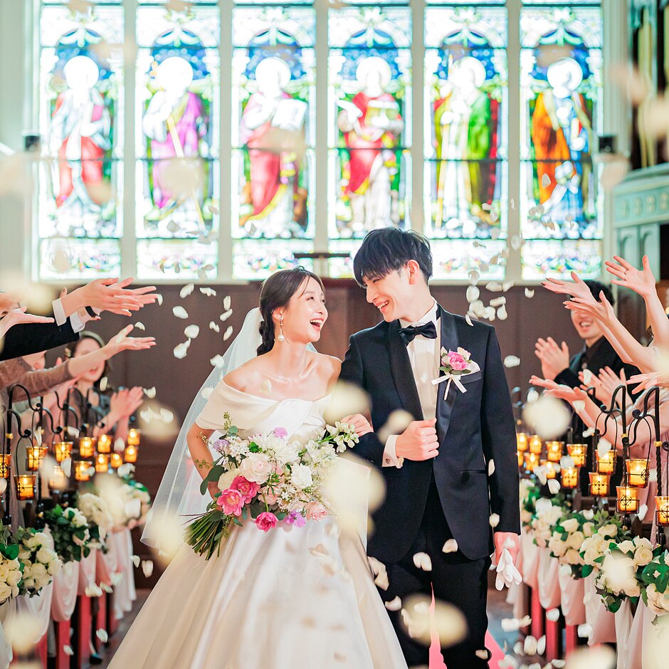 感動的な大聖堂挙式のあとは、ゲストからのフラワーシャワーで温かな祝福に包まれて、幸せな時間を過ごして