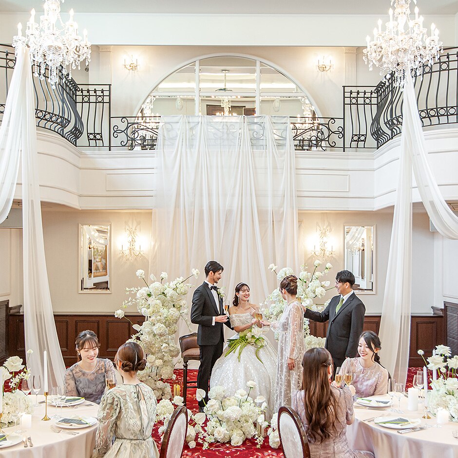 クラシカルで上品な雰囲気が漂い、華やかな演出やコーディネートも似合う。2フロア吹き抜けのパーティ会場