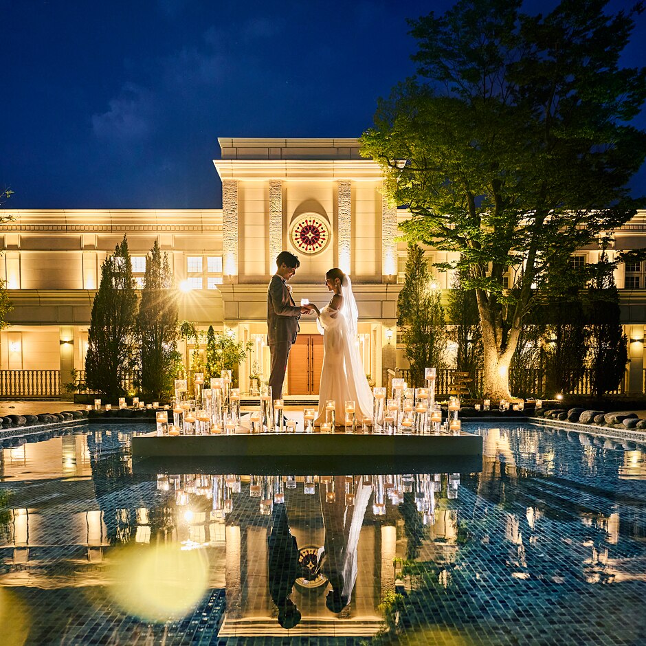 感動の挙式後はチャペル前に広がるガーデンでフラワーシャワーなどアフターセレモニーを楽しめる。ナイトタイムはより一層ラグジュアリーな雰囲気に。前撮りなどで特別な時間を楽しむ先輩カップルも多数!