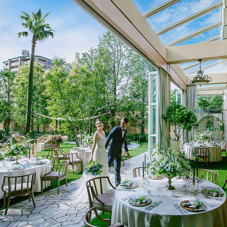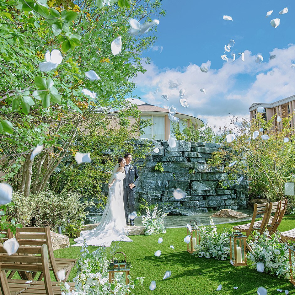 ヤシの木がそびえる広大なガーデンを持つレストラン【ル・ジャルダン】は、まるで小さなリゾートへ訪れたよう。貸切邸宅【セリーズ】では滝を背にしたセレモニーが叶う。ガーデン演出を希望しているふたりは必見!