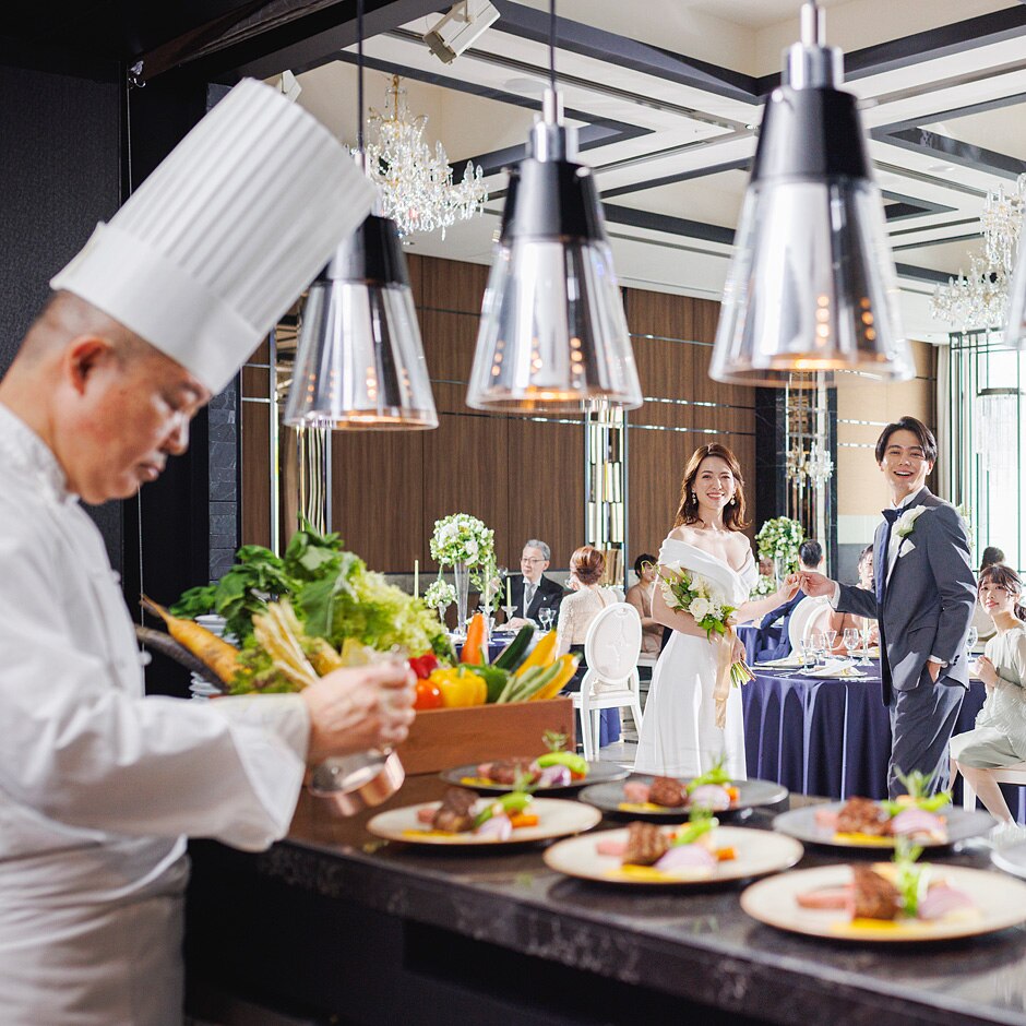フレンチや和食の魅力を絶妙に掛け合わせて創られる同ホテルの婚礼料理。季節に合わせた食材、想い出の料理、アレルギー対策などを踏まえシェフから提案される、ふたりだけのオリジナルコースでゲストをもてなそう。