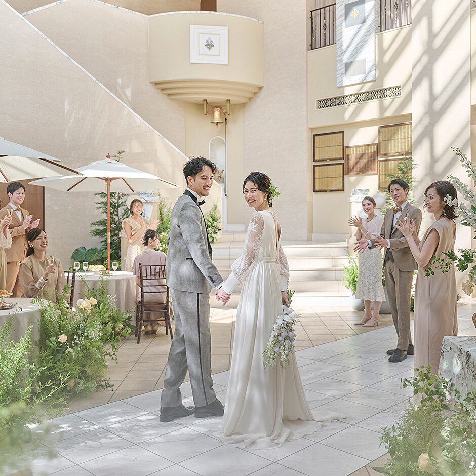 京都の中心地にありながら日常を忘れさせる特別な空間!心地よい日差しを感じながら大切な皆様と至福の時間。厳かな挙式の後は祝福ムードの笑顔あふれる時間をお迎えいただきます