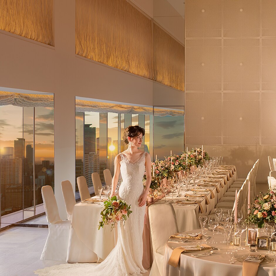 世界126ヵ国で展開するヒルトン。最上階地上105mのチャペルは両サイドのカーテンが上がり、パノラマに広がる絶景を望む。世界水準のホスピタリティ、30種から選べるプリフィクスメニュー、最新トレンドのコーディネートで、憧れのウエディングを叶えよう。