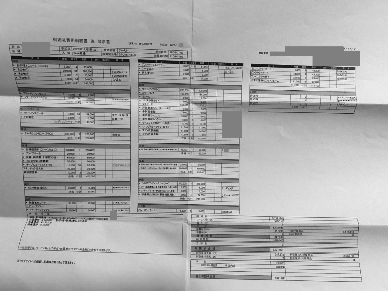 ※投稿された金額情報は、日取り、申込みのタイミングや会場の空き状況等によって異なるため、最終費用明細の項目や金額をもとにした、式場との価格交渉や追加サービス等の要望はご遠慮ください。