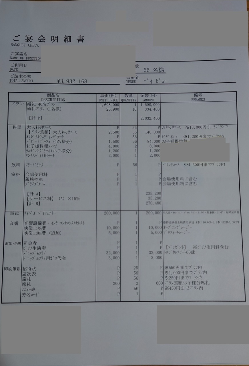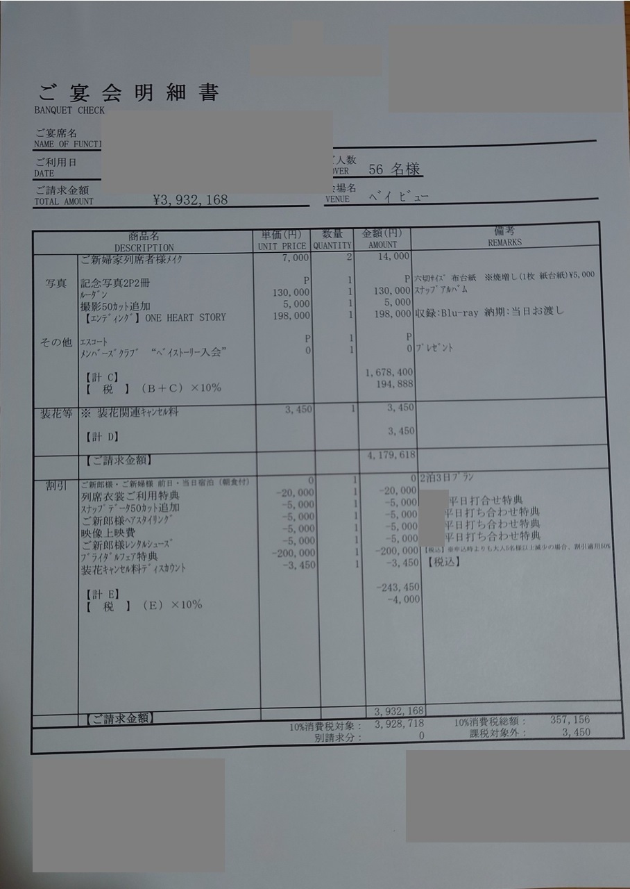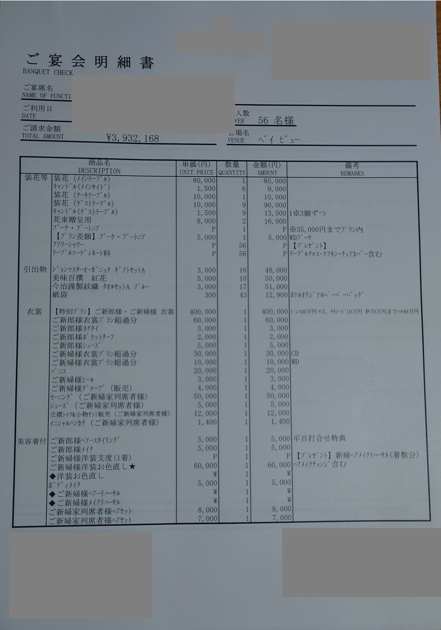 ※料金実例では申込金などを含む会場に支払った"総額"を表示しています。また、料金明細画像の項目名をもとに独自の基準で分類しています。