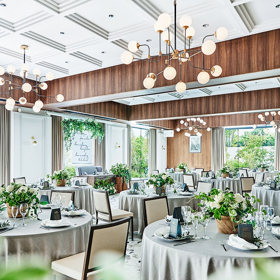 パーティは白×グレーを基調としたくすみカラーが映える大人数専用会場と木の温もりに包まれたナチュラルな会場から選択を。ともに専用のゆったりしたホワイエやテラスガーデンが併設されており、多彩な演出に対応。