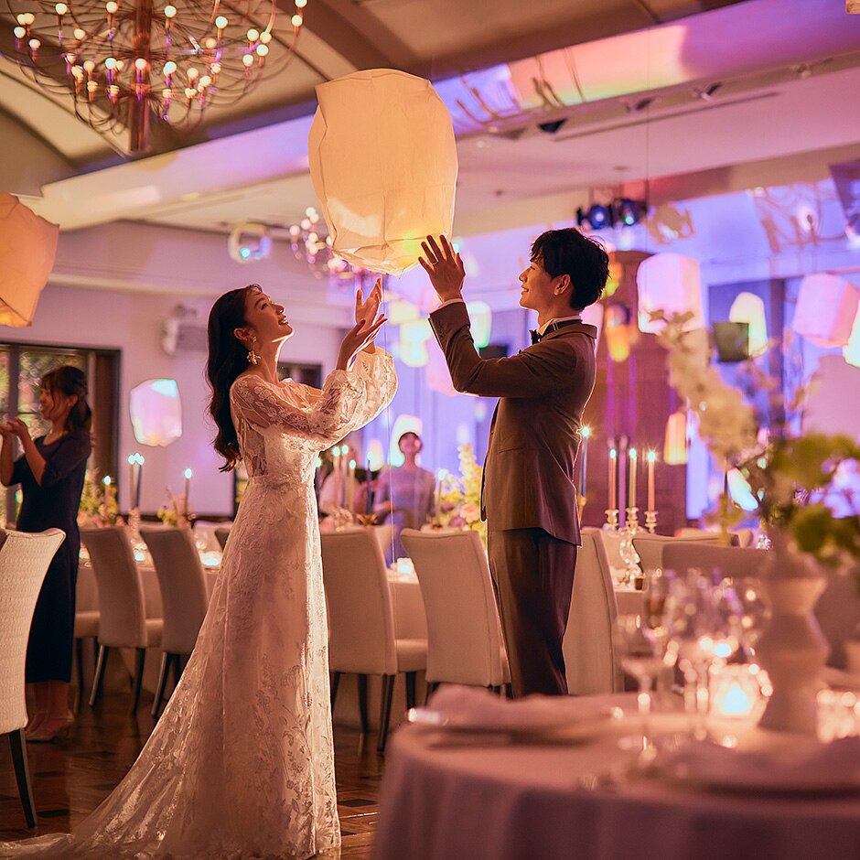 ランタンとプロジェクションマッピングが融合した人気の演出。幻想的な空間に包まれる瞬間は感動のワンシーンになるはず。映像・音・光の演出を組み合わせて、ふたりらしいパーティを叶えてみて!