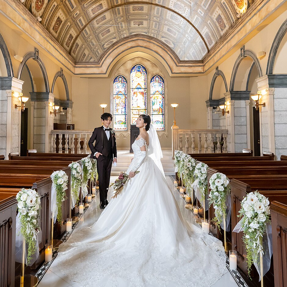 誓いの舞台は、荘厳な雰囲気が漂うロマネスク様式の本格チャペル。美しいステンドグラス、天井絵などの調度品が誓いをより印象的に演出してくれる。感動や喜びが自然と伝わる、ゲストとの距離が近いセレモニーを叶えよう。