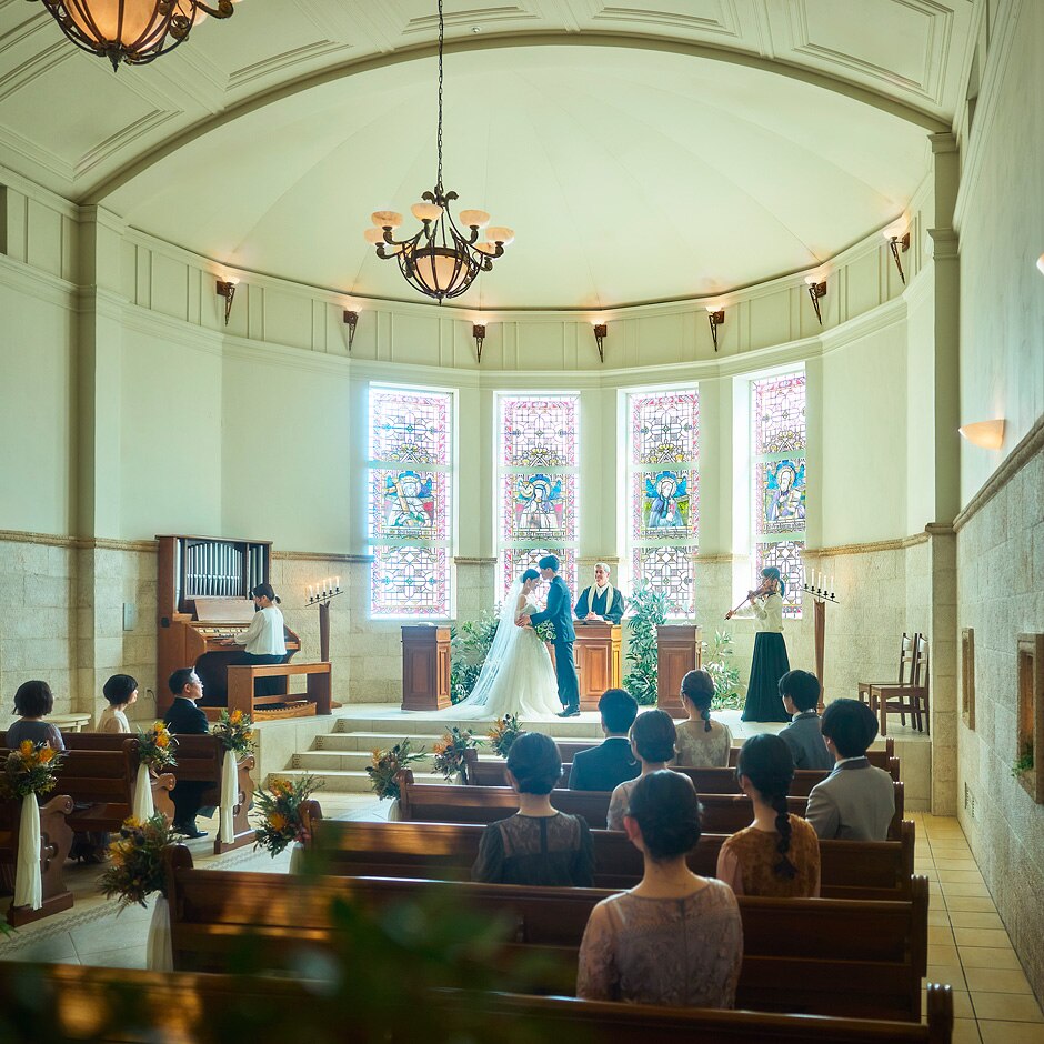 地中海リゾートの街並みを散策するような非日常感あふれる空間がお気に入り。ステンドグラスが美しいチャペルや、アットホームな披露宴会場などふたり好みだった。「ナイトウエディングで素敵な雰囲気を演出したかったので、照明を調節できたことも良かったです。料理の質も重視していて、試食した料理も決め手でした」。