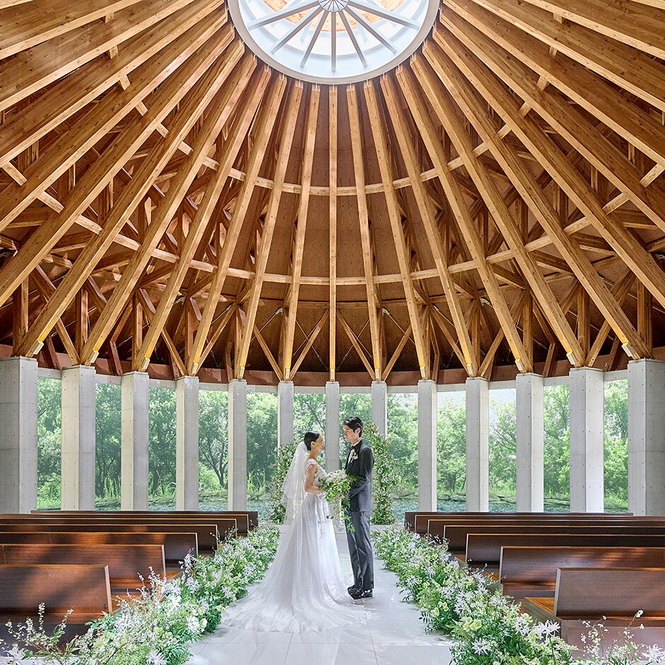 建築家やデザイナーのセンスが光る芸術的なチャペルが、ふたりの誓いの舞台に。自然の恵みがふたりを優しく包み込み、神聖な誓いの時間を温かく見守ってくれる。自然が彩る空間でみんなの心に刻まれるセレモニーを。